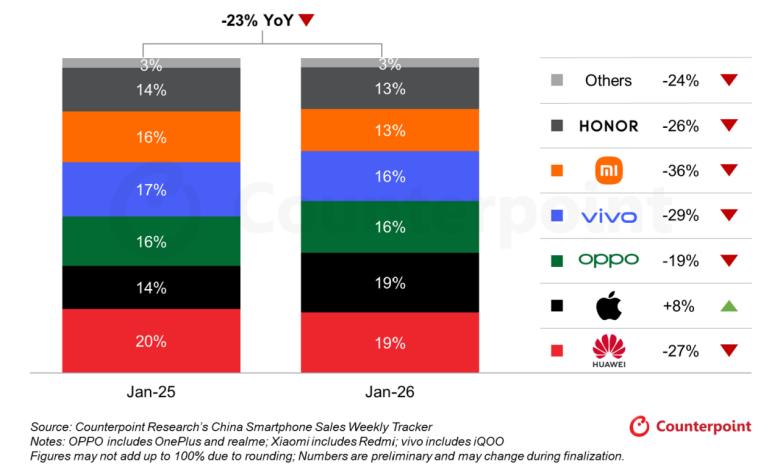 前不久,机构Counterpoint Research 发布了中国智能手机周度销量追踪报告,数据不太好看。今年1月,中国智能手机销量同比下降23%,大多数国产品牌都遭遇了两位数的下滑幅度,只有苹果保持了同比正增长。