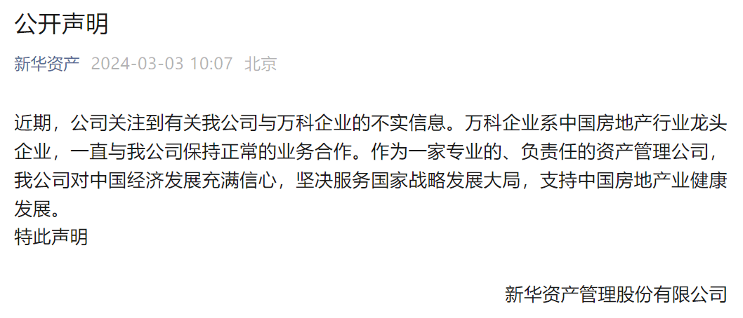 3月3日,新华资产发布公开声明称,有关本公司与万科企业的消息为不实消息。对此,万科并未进行官方回应。