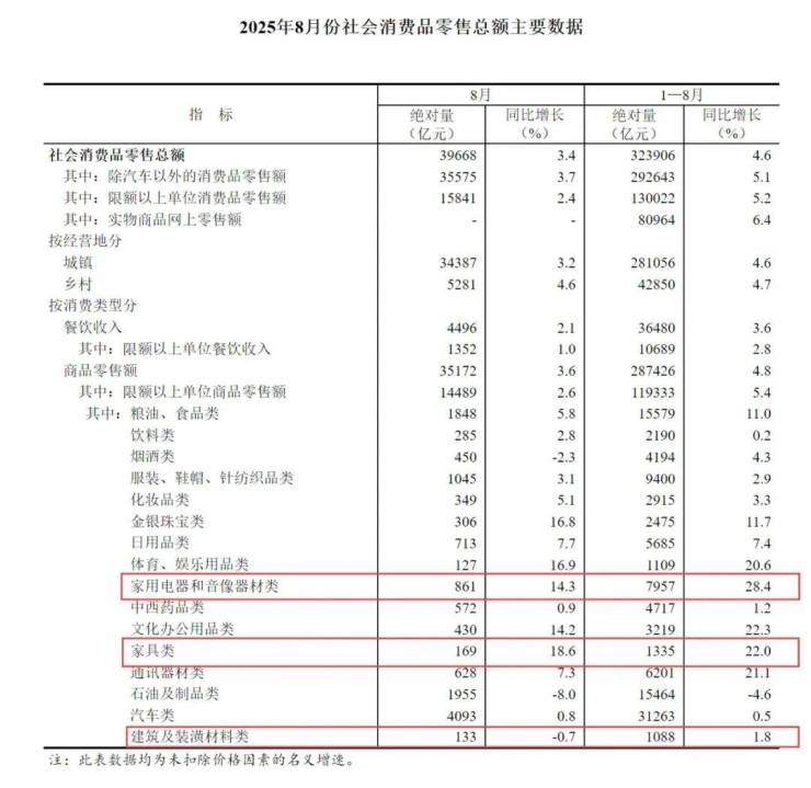 9月15日,国家统计局发布数据,8月份国民经济运行总体平稳、稳中有进。消费品以旧换新政策效果继续显现,限额以上单位家具类、家用电器和音像器材类、建筑及装潢材料类零售额分别为169亿元、861亿元、133亿元,同比增长18.6%、14.3%、-0.7%。