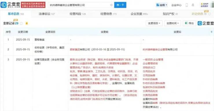 企查查APP显示,近日,顾家集团有限公司发生工商变更,企业名称变更为杭州德烨嘉俊企业管理有限公司,同时,经营范围变更为“企业管理咨询;货物进出口;日用品批发;日用品销售;针纺织品销售等”。