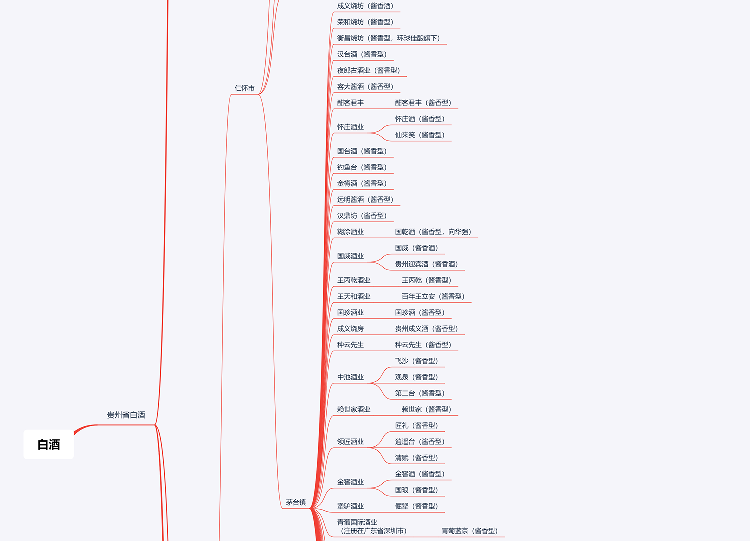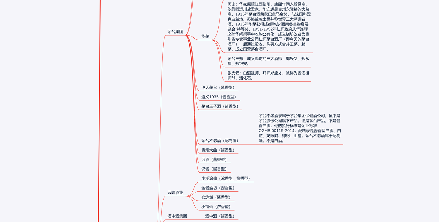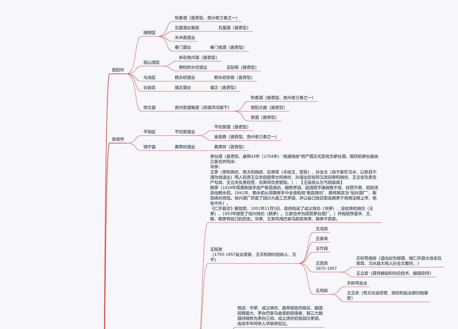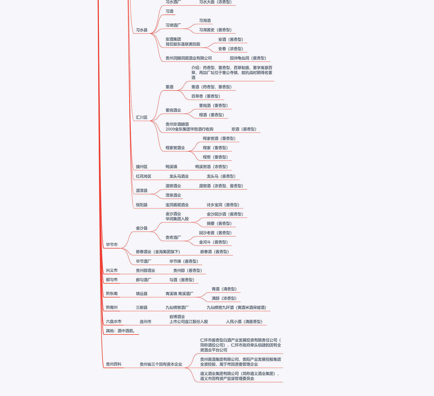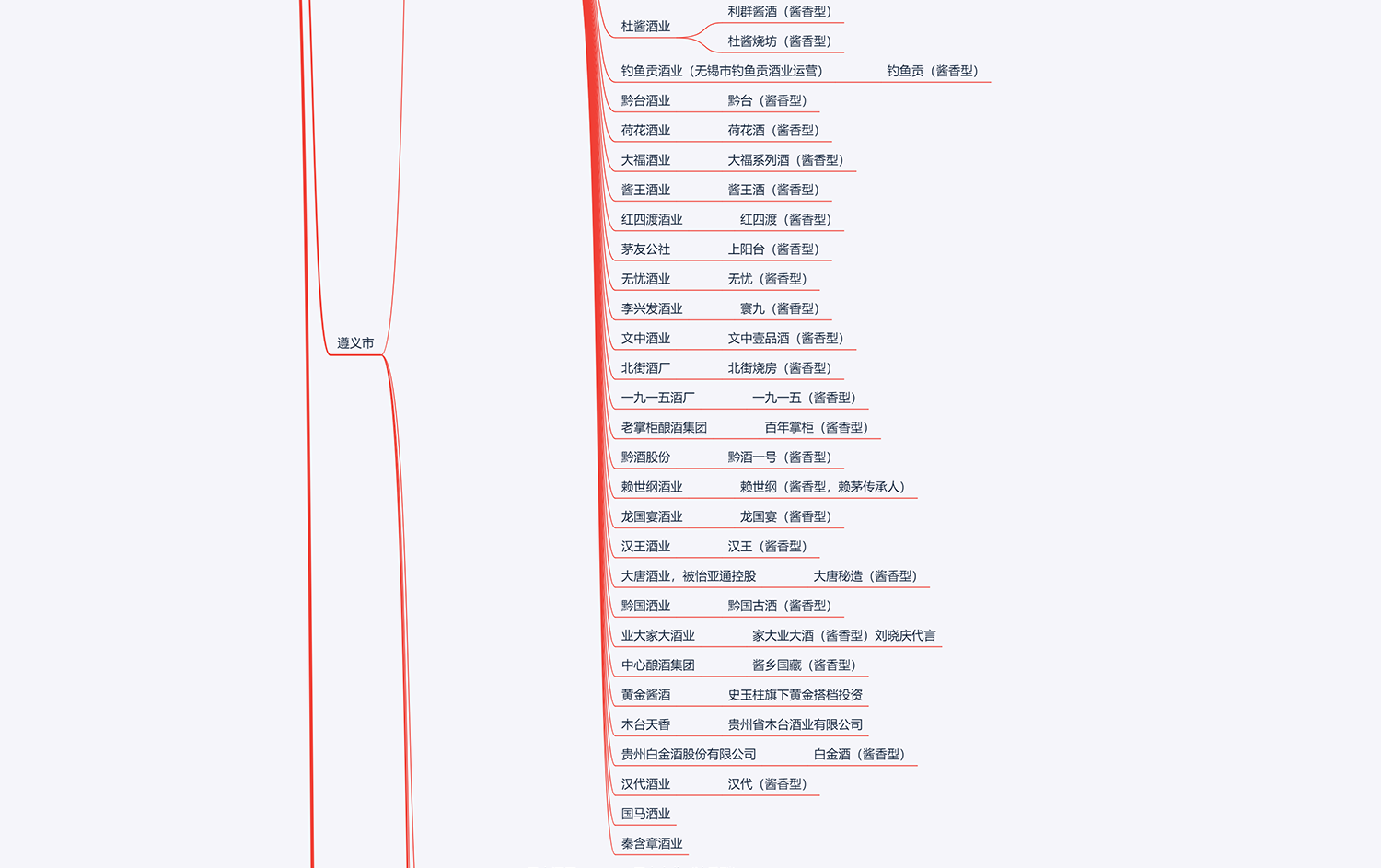 贵阳市 • 南明区 • 筑春酒(酱香型,贵州老三春之一) • 五星酒业集团 • 五星酒(酱香型) • 未来酱酒业 • 春门酒业 • 春门老酒(酱香型) • 观山湖区 • 多彩贵州酒(酱香型) • 荣和黔水坊酒业 • 王阳明(酱香型) • 乌当区 • 赖永初酒业 • 赖永初珍藏(酱香型) • 云岩区 • 雄正酒业 • 雄正(酱香型) • 修文县 • 贵州贵酒集团(苏酒洋河旗下) • 黔春酒(酱香型,贵州老三春之一) • 贵阳大曲(酱香型) • 贵酒(酱香型) 安顺市 • 平坝区 • 平坝窖酒业 • 平坝窖酒(酱香型) • 金壶春(酱香型,贵州老三春之一) • 镇宁县 • 黄果树酒业 • 黄果树(酱香型) 遵义市 • 仁怀市 • 茅台集团 • 茅台酒(酱香型,康熙43年(1704年)“偈盛烧房”将产酒正式定名为茅台酒。现在的茅台是由三家合并而来: 华茅; 王茅(荣和烧坊,荣太和烧房,石荣霄(本姓王,管账)、孙全太(由于家在习水,以账目不清为由退出)两人投资王立夫创建荣太和烧坊,孙退出后名称又改回荣和烧坊,王立安负责生产勾调,王立夫负责经营,石荣宵负责管账。);【王振发从乞丐到富商】 赖茅(1929年周秉衡接手祖产衡昌烧坊,酿售茅酒,因酒质平庸销售不佳,经营不善,后抵债卖给赖永初。1941年,赖永初从周秉衡手中全资收购“衡昌烧坊”,赖将其改为“恒兴酒厂”,衡昌烧坊终结。恒兴酒厂研发了回沙大曲工艺茅酒,并以自己姓氏取名赖茅于香港注册上市,驰名中外)。 《仁怀县志》解放后,1951年11月5日,政府购买了成义烧坊(华茅),没收荣和烧坊(王茅),1953年接管了恒兴烧坊(赖茅)。三家合并为国营茅台酒厂。)并购顺序是华、王、赖,赖茅有自己的历史。华茅、王茅共用巴拿马获奖殊荣,赖茅不具备。 • 王振发 (1793-1857盐业发家,王天和烧坊创始人,五子) • 王鸿宾 • 王家宾 • 王作宾 • 王国宾 1870-1957 • 天和号烧房(道光封为御酒,被仁怀县大地主石荣霄,习水县大商人孙全太看好。) • 王立安(具有酿造和勾兑技术,酿酒宗师) • 王用宾 • 天和号盐业 • 王立夫(有文化会经营,烧坊和盐业都归他掌管) • 华茅 • 概述:华茅,成义烧坊,最早被政府赎买,酿酒规模最大,茅台巴拿马金奖的获得者,其三大酿酒师被称为茅台三郑。成义烧坊初名回沙茅酒,由咸丰年间举人华联辉创立。 • 历史:华家原籍江西临川,康熙年间入黔经商,依靠贩运川盐发家。华连辉是贵州永隆裕的大盐商。1915年茅台酒荣获巴拿马金奖。与法国科涅克白兰地、苏格兰威士忌并称世界三大蒸馏名酒。1935年华茅获得成都举办“西南各省物资展览会”特等奖。1951-1952年仁怀政府从华连辉之孙华问渠手中收购公有化,成义烧坊改名为贵州省专卖事业公司仁怀茅台酒厂(即今天的茅台酒厂),后通过没收、购买方式合并王茅、赖茅,成立国营茅台酒厂。 • 茅台三郑:成义烧坊的三大酒师:郑兴义、郑永福、郑银安。 • 张支云:白酒祖师,拜师郑应才,被称为酱酒祖师爷、活化石。 • 飞天茅台(酱香型) • 遵义1935(酱香型) • 茅台王子酒(酱香型) • 茅台不老酒(配制酒) • 茅台不老酒隶属于茅台集团保健酒公司,虽不是茅台股份公司旗下产品,也是茅台产品,不是酱香白酒,他的执行标准是企业标准:QGMBJ0011S-2014,配料表是酱香型白酒、白芷、龙眼肉、枸杞、山楂。茅台不老酒属于配制酒,不是白酒。 • 贵州大曲(酱香型) • 习酒(酱香型) • 汉酱(酱香型) • 云峰酒业 • 小糊涂仙(浓香型、酱香型) • 金酱酒坊(酱香型) • 心悠然(酱香型) • 小福仙(浓香型) • 酒中酒集团 • 酒中酒(酱香型) • 茅台镇 • 成义烧坊(酱香酒) • 荣和烧坊(酱香型) • 衡昌烧坊(酱香型,环球佳酿旗下) • 汉台酒(酱香型) • 夜郎古酒业(酱香型) • 容大酱酒(酱香型) • 酣客君丰 • 酣客君丰(酱香型) • 怀庄酒业 • 怀庄酒(酱香型) • 仙来笑(酱香型) • 国台酒(酱香型) • 钓鱼台(酱香型) • 金樽酒(酱香型) • 远明酱酒(酱香型) • 汉鼎坊(酱香型) • 糊涂酒业 • 国乾酒(酱香型,向华强) • 国威酒业 • 国威(酱香酒) • 贵州迎宾酒(酱香酒) • 王丙乾酒业 • 王丙乾(酱香型) • 王天和酒业 • 百年王立安(酱香型) • 国珍酒业 • 国珍酒(酱香型) • 成义烧房 • 贵州成义酒(酱香型) • 种云先生 • 种云先生(酱香型) • 中池酒业 • 飞沙(酱香型) • 观泉(酱香型) • 第二台(酱香型) • 赖世家酒业 • 赖世家(酱香型) • 领匠酒业 • 匠礼(酱香型) • 逍遥台(酱香型) • 清赋(酱香型) • 金窖酒业 • 金窖酒(酱香型) • 国琅(酱香型) • 犟驴酒业 • 倔犟(酱香型) • 青葡国际酒业 (注册在广东省深圳市) • 青萄蓝京(酱香型) • 杜酱酒业 • 利群酱酒(酱香型) • 杜酱烧坊(酱香型) • 钓鱼贡酒业(无锡市钓鱼贡酒业运营) • 钓鱼贡(酱香型) • 黔台酒业 • 黔台(酱香型) • 荷花酒业 • 荷花酒(酱香型) • 大福酒业 • 大福系列酒(酱香型) • 酱王酒业 • 酱王酒(酱香型) • 红四渡酒业 • 红四渡(酱香型) • 茅友公社 • 上阳台(酱香型) • 无忧酒业 • 无忧(酱香型) • 李兴发酒业 • 寰九(酱香型) • 文中酒业 • 文中壹品酒(酱香型) • 北街酒厂 • 北街烧房(酱香型) • 一九一五酒厂 • 一九一五(酱香型) • 老掌柜酿酒集团 • 百年掌柜(酱香型) • 黔酒股份 • 黔酒一号(酱香型) • 赖世纲酒业 • 赖世纲(酱香型,赖茅传承人) • 龙国宴酒业 • 龙国宴(酱香型) • 汉王酒业 • 汉